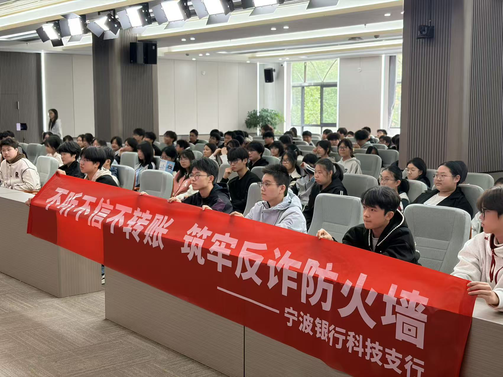近日,宁波银行科技支行携手海曙反诈中心,共同走进浙江商业技师学院,开展了一场别开生面、内容丰富的“青力反诈,甬守校园”主题宣传活动。活动通过国旗下动员、专题报告会和趣味互动问答三大环节,为全校师生带来了一堂生动而深刻的反诈必修课。