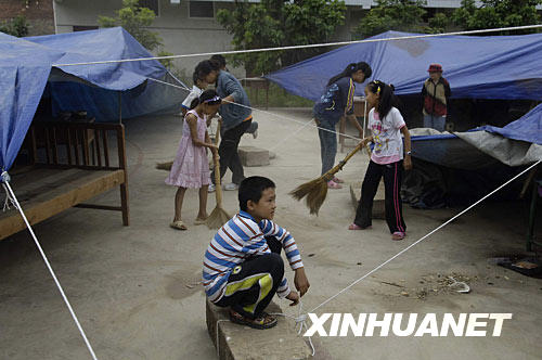 8月31日,几名儿童在攀枝花市仁和区大龙潭彝族乡拉鲊村拉鲊小学内的临时棚屋安置点内。新华社记者 海明威 摄