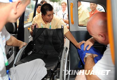 9月4日,一位法国运动员乘坐无障碍出租车。北京残奥会为参赛运动员提供了多种无障碍交通服务,不仅在残奥会专用大巴上设有轮椅专用席位,而且还提供了无障碍出租车,方便运动员出行。新华社记者徐家军摄