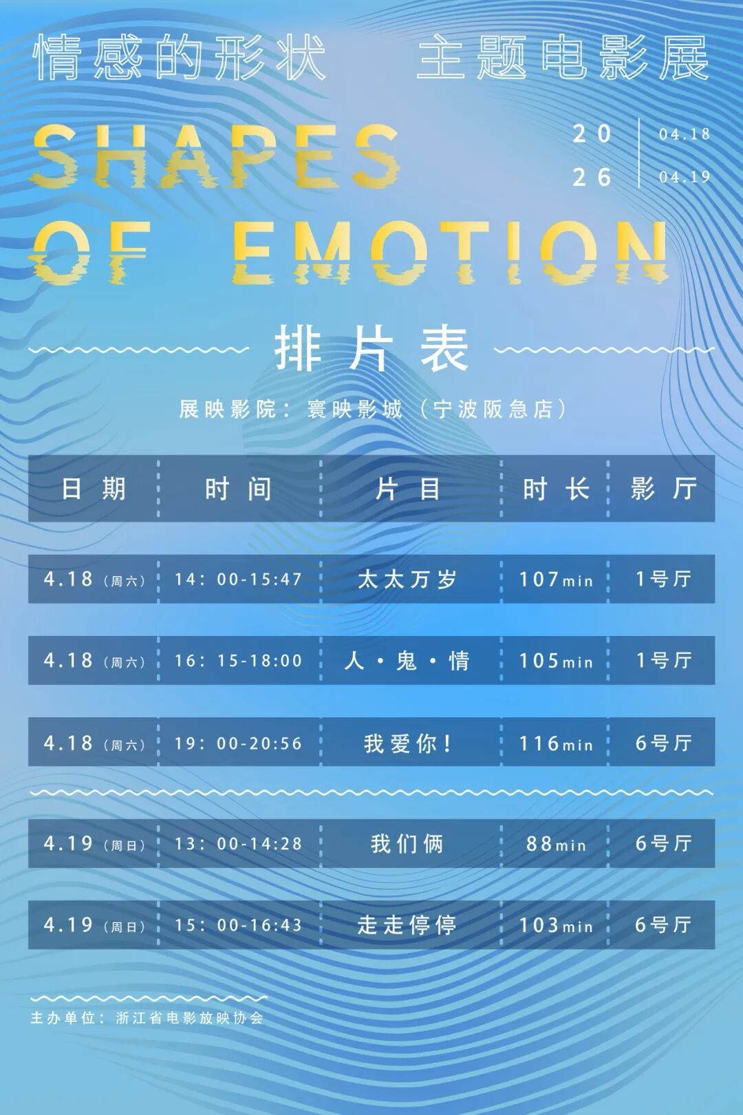 作为电影嘉年华配套活动,4月18日、4月19日,“情感的形状”主题电影展在宁波寰映影城阪急店举行,将上映《太太万岁》《人·鬼·情》《我爱你》《我们俩》《走走停停》等5部公映时间跨度从1947年至2024年的不同年代作品。